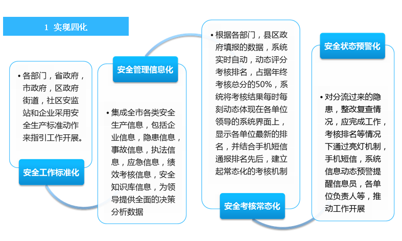 對省、市、區縣政府相關職能部門設立績效考核指標,突出過程考核、量化考核。信息平臺自動統計、自動計分、自動排名,考核結果納入年度安全生產“一崗雙責”責任制考核,通過績效考核,有效促進屬地、行業部門履行各司其職、齊抓共管。
