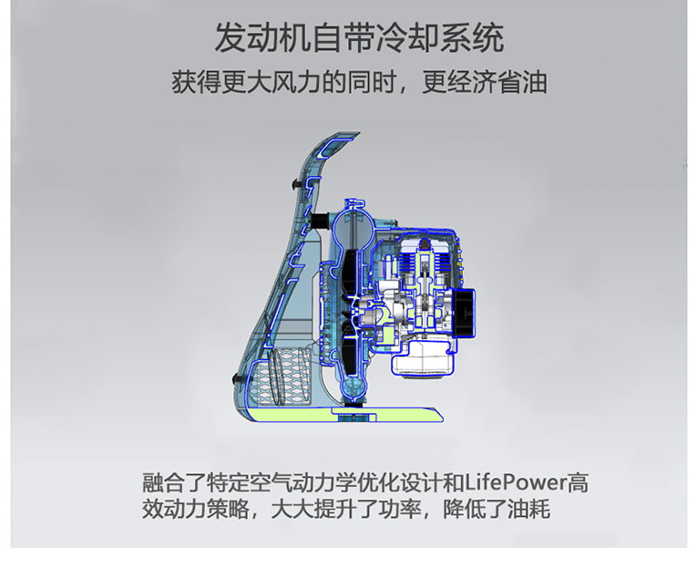 發動機自帶冷卻系統,減少風量的損失,獲得更大風速經濟性好,燃油消耗量低