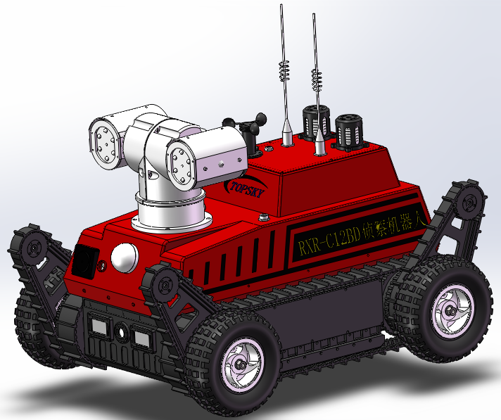 1) 車體★結構型式:采用前后4擺臂+履帶+金屬輪胎的結構形式,最大有效提高前進速度、越障性能,同時金屬輪胎可以抗高溫,適合在火區高溫滅火救援。