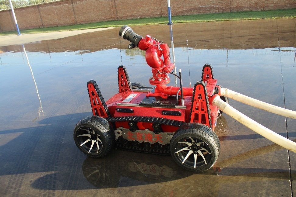 消防滅火機器人采用履帶+擺臂+輪式的底盤設計,能夠適應救援環境中各種復雜地面。裝配環境檢測裝置,在滅火的同時對現場環境數據進行偵測。消防滅火偵查機器人由機器人主體,消防炮,環境檢測裝置,遙控箱四部分組成。主要作用是代替消防隊員進入易燃易爆、有毒、缺氧、濃煙等危險災害事故現場實施有效的滅火救援、化學檢測和火場偵察。