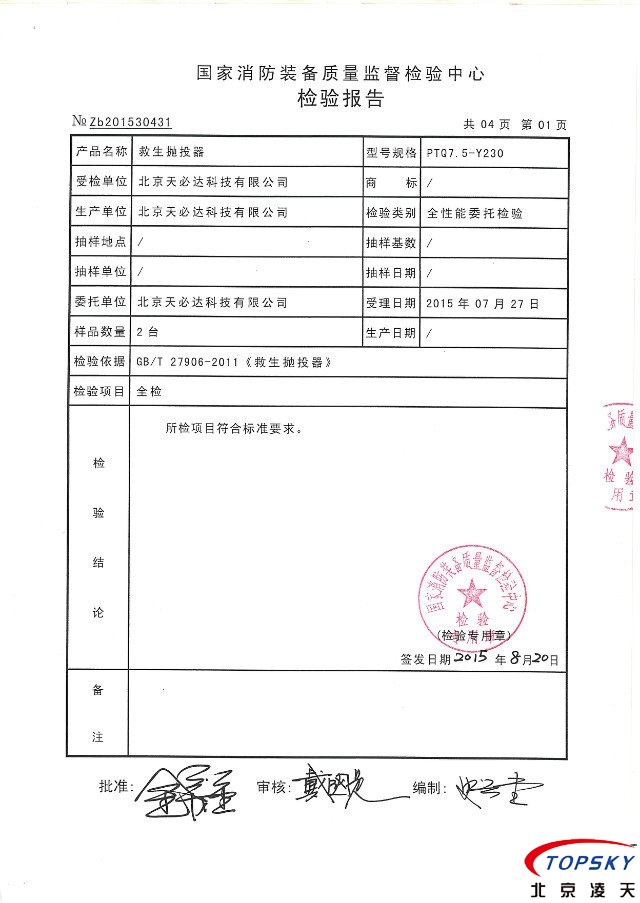 PTQ7.5-Y230型氣動遠距離救生拋投器取得消防檢測報告。