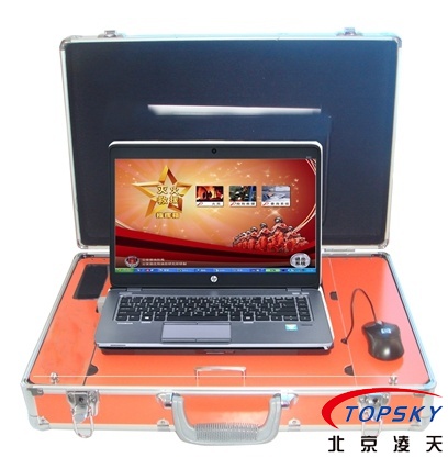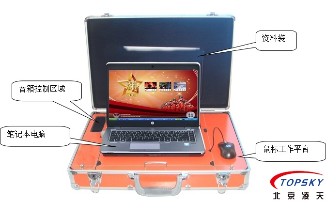 開式手提箱結(jié)構(gòu),箱體上蓋部分為資料存放處,下箱體部分的上層為筆記本電腦操作平臺(tái),右側(cè)為鼠標(biāo)工作平臺(tái),左側(cè)為音箱控制區(qū)域,下箱體的下層部分為一起設(shè)備存放區(qū)域;