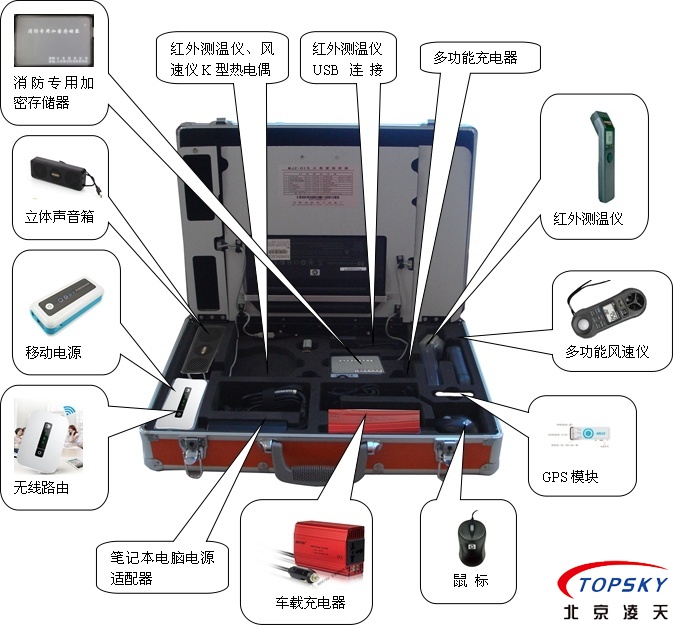 整套設(shè)備包括:筆記本電腦、紅外測(cè)溫儀、多功能風(fēng)速儀、GPS模塊、消防專用加密存儲(chǔ)器、立體聲音箱、無(wú)線路由器、電源系統(tǒng)、鼠標(biāo)、車載充電器、移動(dòng)電源、筆記本電腦適配器、便攜箱、防水迷彩袋;