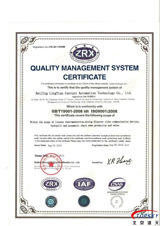 經過嚴格的評審,我司近期按照GB/T19001-2008質量管理體系要求,已經取得ISO9001質量管理體系認證,認證的獲得,標志著我司在管理體系上已經具備較高水平。認證證書的中英文如下: