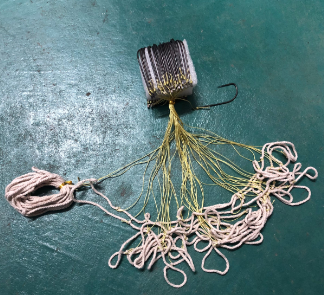 工藝流程參數(shù):勾體粗2.2mm外徑26.8mm長度72.8mm,單枚凈重3.14g,一套滾鉤50枚,長度約5米,主線采用2.5mm回籠線,子線采用雙絞線
