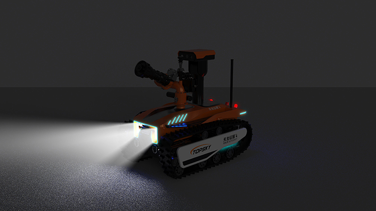 機器人采用無線遙控設計,遙控器與監視器一體/分離,可實時的顯示電池、內部的各種信息,機器人狀態、現場溫濕度、有毒有害氣體濃度報警信息等控制機器人前進、后退、轉向等運動。具備遠程偵察能力,機身搭建升降云臺、高清攝像頭、熱成像攝像頭、氣體傳感器三類環境感知設備和云臺控制設備,也可聯動聲光報警模塊提醒消防人員或群眾,有效避免危險。在通過遠程偵察手段有效獲取現場火源信息后,機器人配備的大功率電機可以幫助消防人員將消防水袋拖拽至危險火源區域進行滅火,并能搭載各類國內、外的多種消防水泡,并能夠遠程控制發射水或泡沫。基于所配備的拾音模塊和揚聲器模塊,拾取現場環境聲音,即使消防官兵未靠近消防現場也能夠聽到搜救現場的群眾呼救聲,并通過揚聲器模塊與群眾進行現場對話。