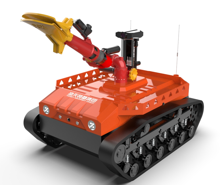 機(jī)器人采用無線遙控設(shè)計,遙控器與監(jiān)視器一體/分離,可實時的顯示電池、內(nèi)部的各種信息,機(jī)器人狀態(tài)、現(xiàn)場溫濕度、有毒有害氣體濃度報警信息等控制機(jī)器人前進(jìn)、后退、轉(zhuǎn)向等運動。具備遠(yuǎn)程偵察能力,機(jī)身搭建升降云臺、高清攝像頭、熱成像攝像頭、氣體傳感器三類環(huán)境感知設(shè)備和云臺控制設(shè)備,也可聯(lián)動聲光報警模塊提醒消防人員或群眾,有效避免危險。在通過遠(yuǎn)程偵察手段有效獲取現(xiàn)場火源信息后,機(jī)器人配備的大功率電機(jī)可以幫助消防人員將消防水袋拖拽至危險火源區(qū)域進(jìn)行滅火,并能搭載各類國內(nèi)、外的多種消防水泡,并能夠遠(yuǎn)程控制發(fā)射水或泡沫。基于所配備的拾音模塊和揚(yáng)聲器模塊,拾取現(xiàn)場環(huán)境聲音,即使消防官兵未靠近消防現(xiàn)場也能夠聽到搜救現(xiàn)場的群眾呼救聲,并通過揚(yáng)聲器模塊與群眾進(jìn)行現(xiàn)場對話。