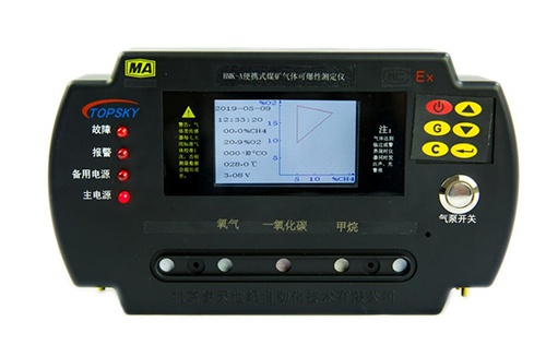 BMK-A便攜式煤礦氣體可爆性測(cè)定儀(以下簡(jiǎn)稱測(cè)爆儀),是用于煤礦井下使用的礦用本安兼隔爆型攜帶式儀器。測(cè)爆儀用于煤礦井下,由礦山救護(hù)隊(duì)員攜帶進(jìn)入災(zāi)區(qū),監(jiān)視作業(yè)環(huán)境周圍氣體組份是否存在爆炸危險(xiǎn)。也可由消火人員攜帶,在處理自然發(fā)火或啟封火區(qū)過(guò)程中,檢測(cè)周圍環(huán)境或密閉內(nèi)空氣中甲烷、氧的濃度值,在儀器液晶顯示屏上直接顯示出O2、CH4、CO的濃度值和環(huán)境溫度值,并顯示出“爆炸三角形”的圖形及各氣體組份所構(gòu)成的坐標(biāo)點(diǎn),臨近或達(dá)到警界限時(shí)儀器同時(shí)發(fā)出聲、光警報(bào)。